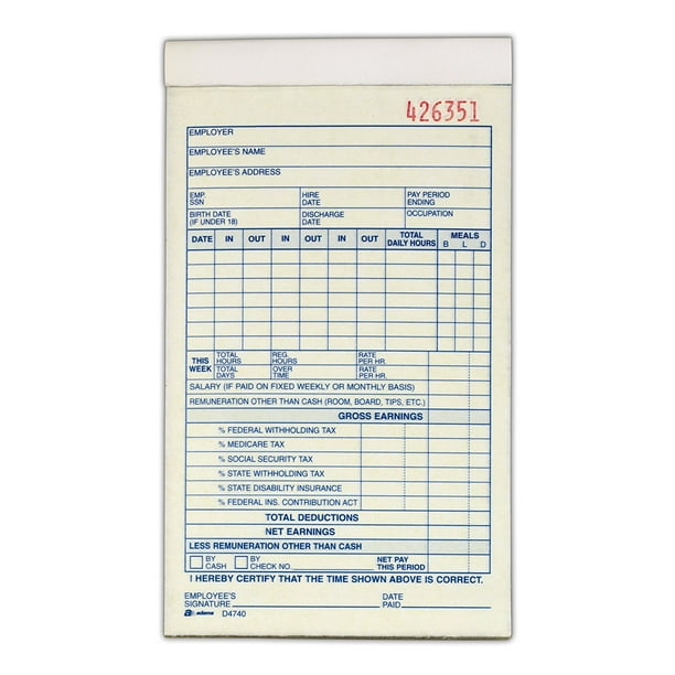 Employee Payroll Record Book 2 Part Carbonless 4 19 X 7 19 50 Sets Per Book White And Canary D4740 Detached Form Size 6 6875 X By Adams Walmart Com